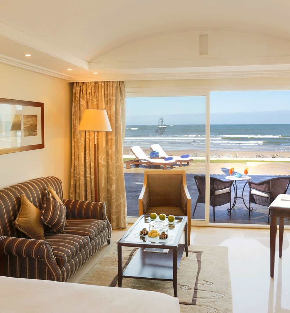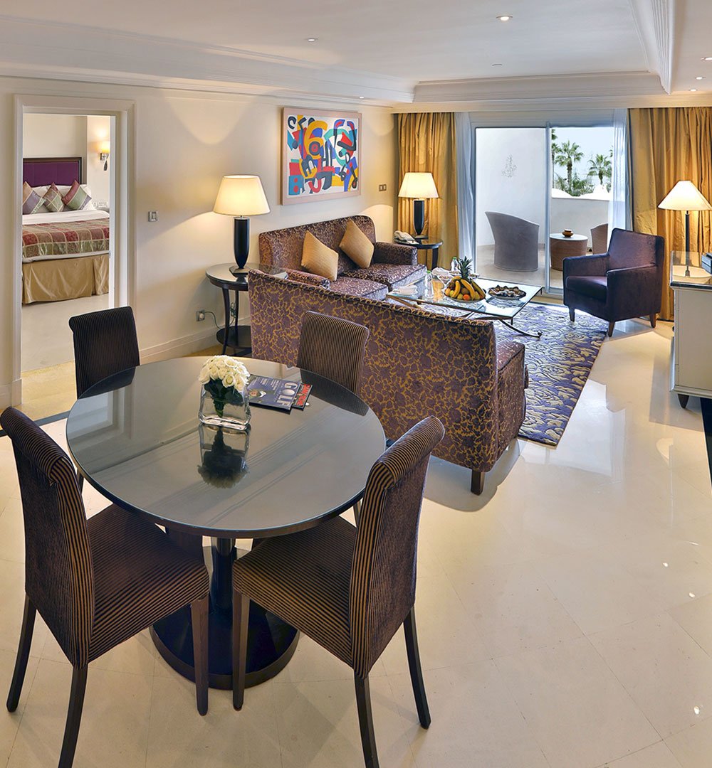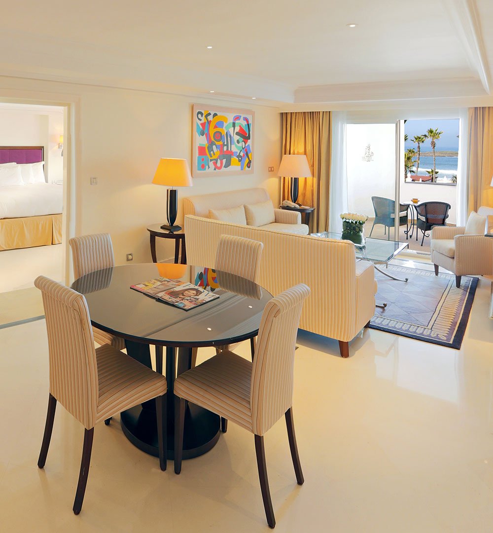Une suite rare et privilégiée, les pieds dans le sable. Avec son accès direct à la plage privée de l’hôtel, elle vous offre un séjour unique entre intimité, confort et horizon bleu. salon lumineux, terrasse avec salle à manger, chaise longue privée en face la plage.
