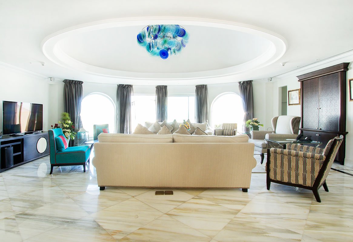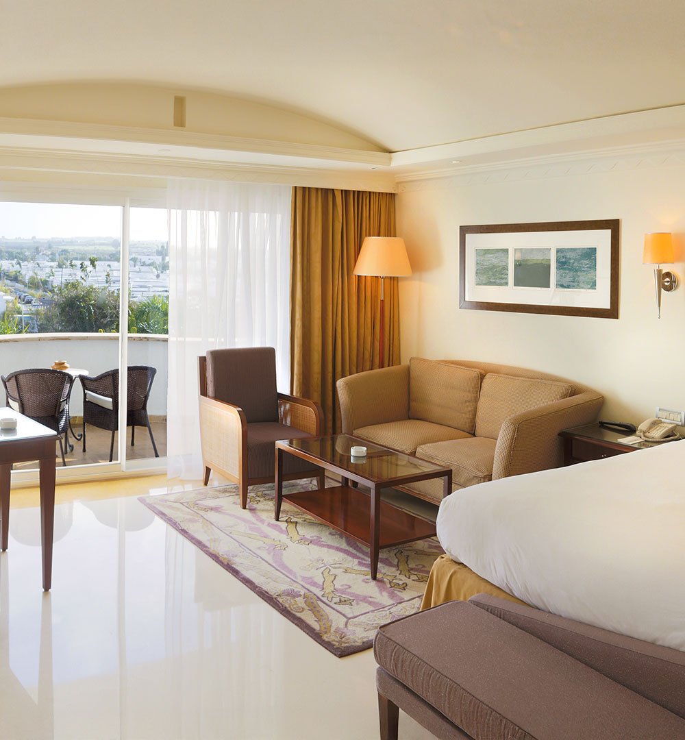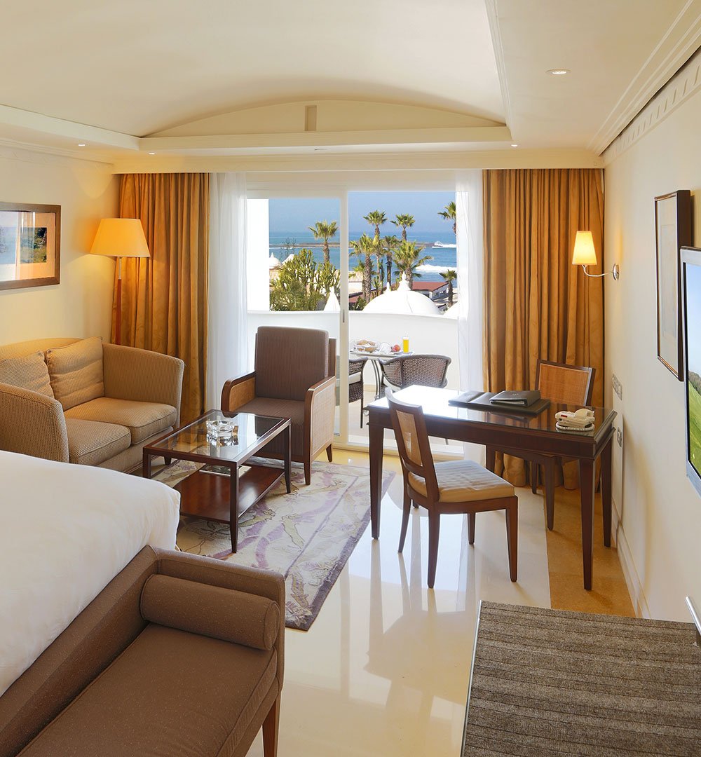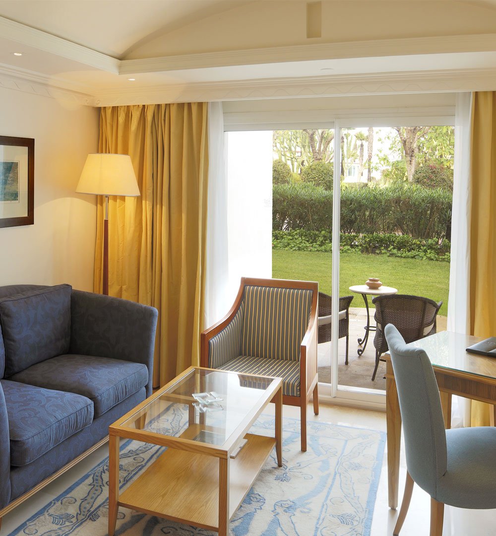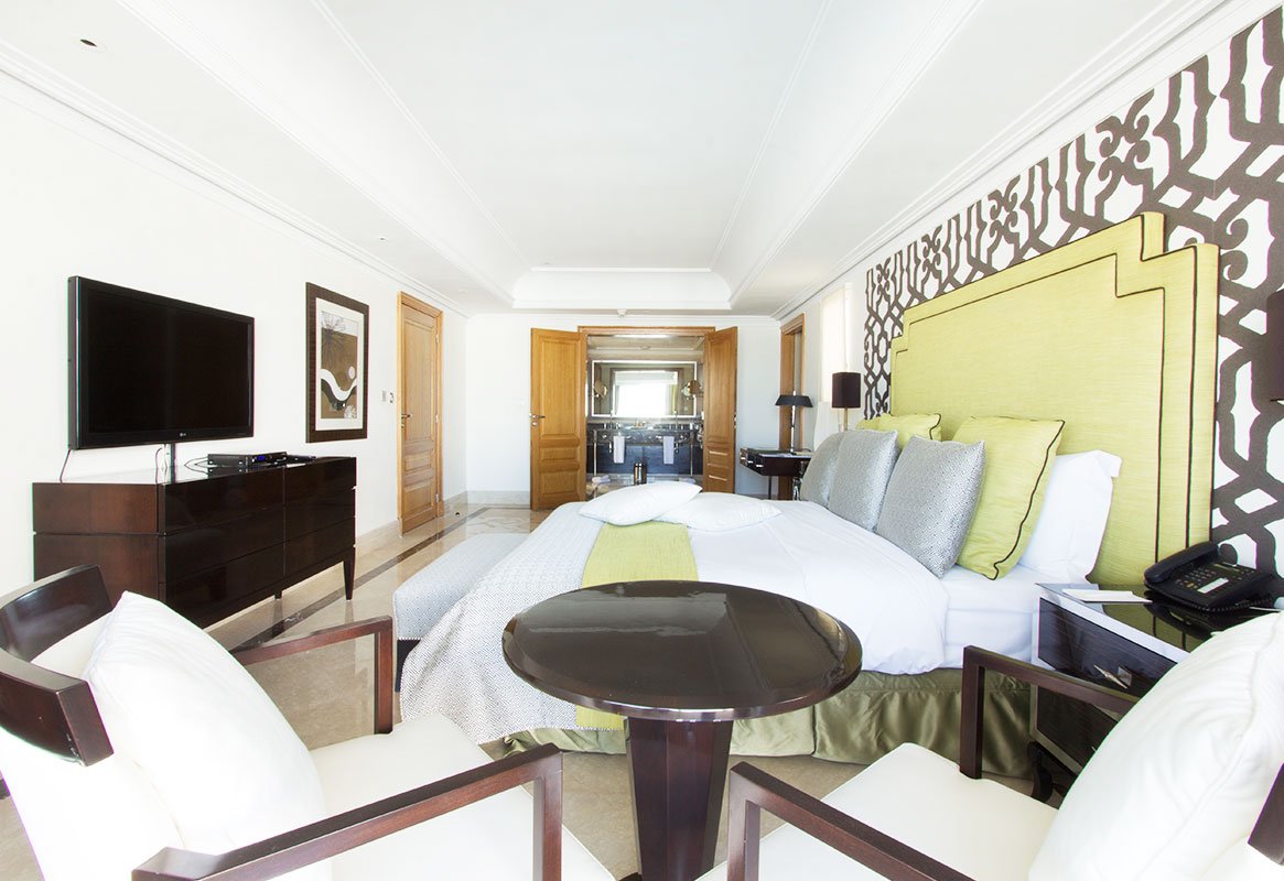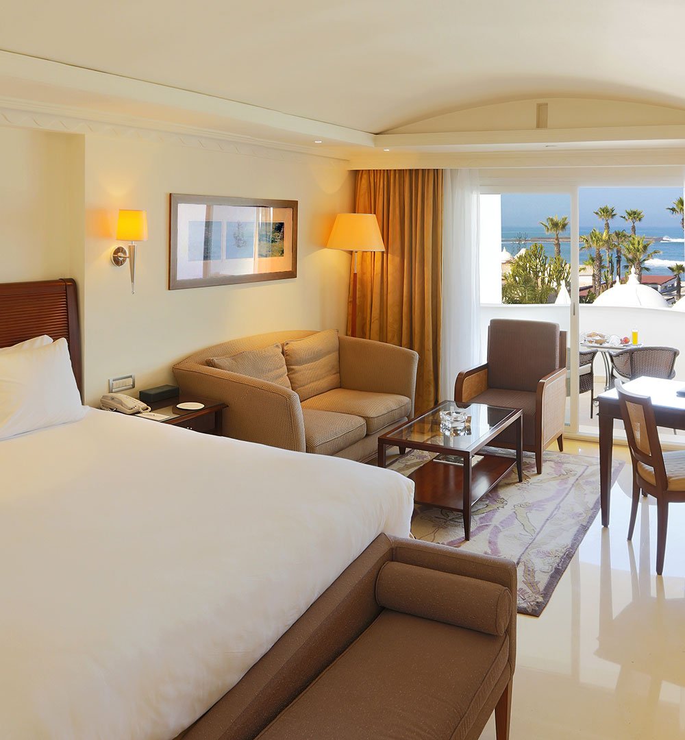 Une suite généreuse séparant élégamment salon et chambre, avec double balcon donnant sur la mer ou les jardins à la décoration contemporaine et aux couleurs apaisantes, avec un espace salon confortable et cosy, offrant une vue imprenable sur la mer ou les jardins.